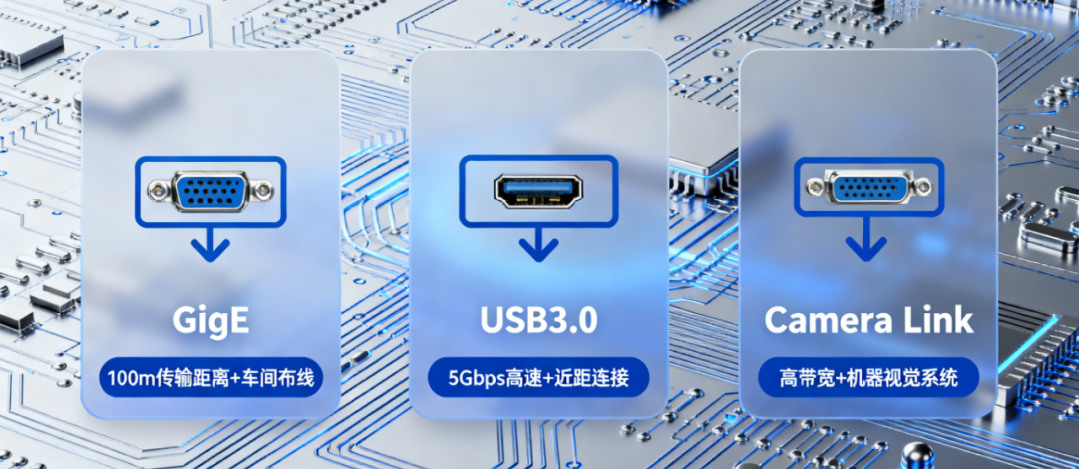 工业相机的接口类型也是一个关键因素,不同的接口可能影响相机的数据传输速度和与其他设备的兼容性。常见的接口包括USB 2.0、USB 3.0、GigE(千兆以太网)、Camera Link等。