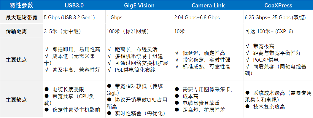 - 需确定传输接口类型,高速传输场景(如实时分析)选择GigE Vision、Camera Link等接口;普通场景可选择USB3.0接口。